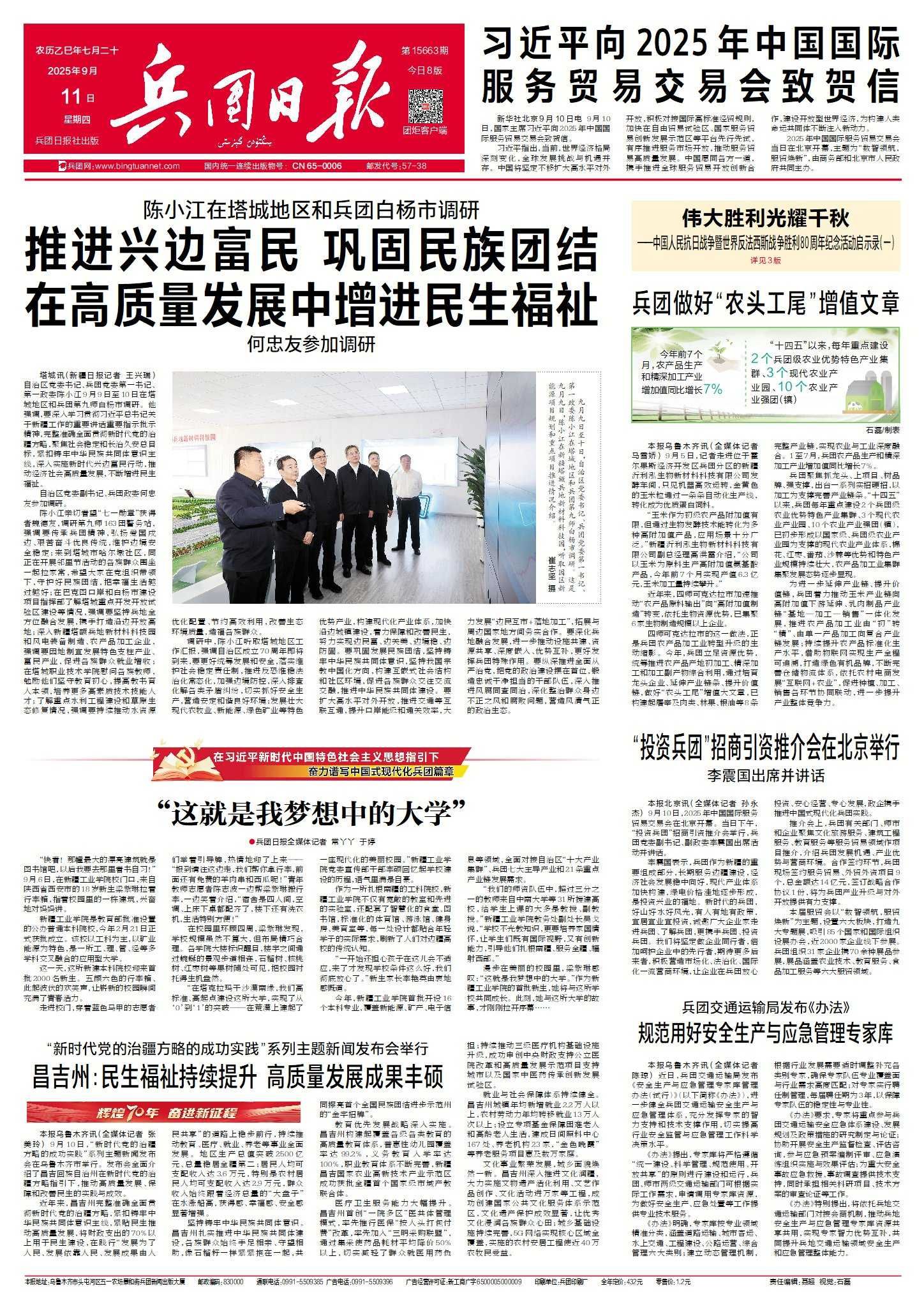 9月11日,兵团日报头版发表《“这就是我梦想中的大学”》,对beat365官网2025年迎新工作及学校建设情况进行报道,全文如下: